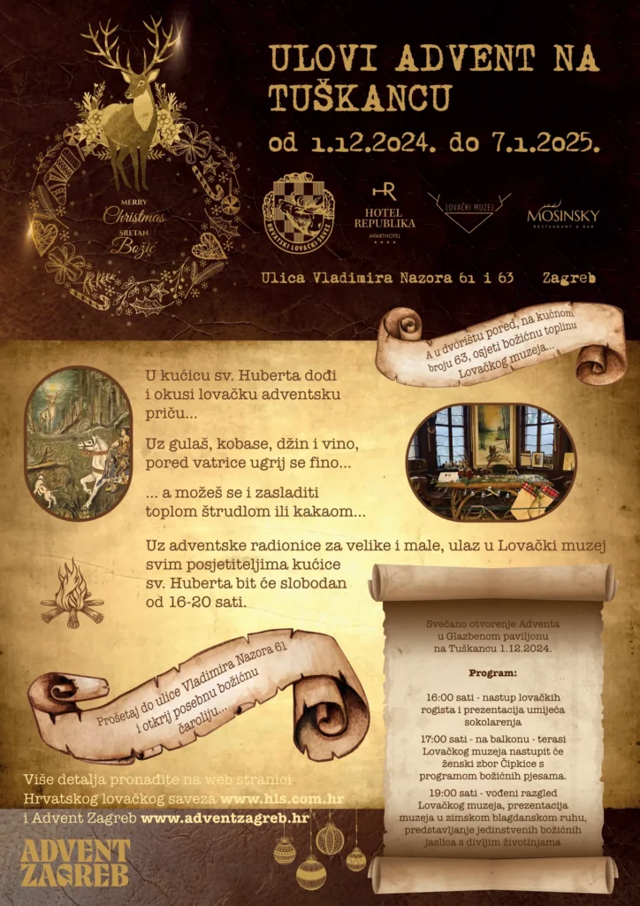 Hrvatski lovački savez uz Hotel Republiku, restoran Mošinsky i Lovački muzej danas su službeno otvorili Lovački Advent na Tuškancu i brojim posjetiteljima svih uzrasta predstavili jedinstven i bogat program ovogodišnjeg Adventa. Događanje je započelo u Glazbenom paviljonu u Park šumi Tuškanac zapaženim nastupom Prvog hrvatskog društva lovačkih rogista Brezovica Novi Zagreb koji na sceni djeluju već punih 30 godina. Repertoar je sadržavao niz tradicionalnih izvedbi koje se izvode kao pratnja lovu.