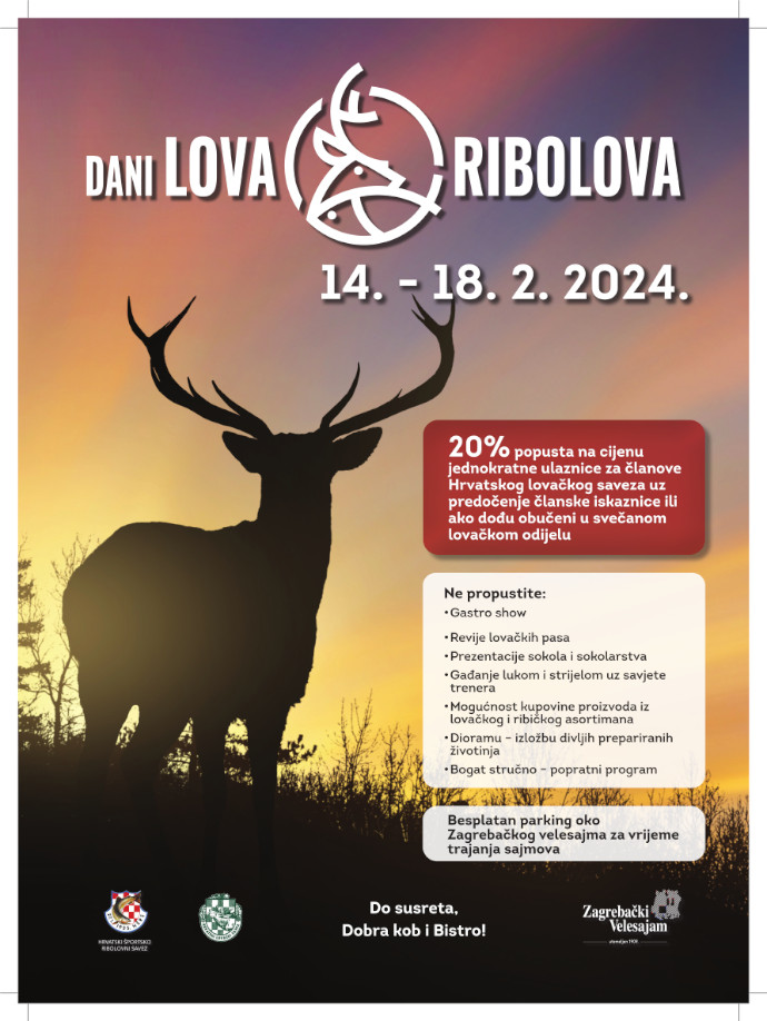 Na Zagrebačkom velesajmu od 14. do 18. veljače 2024. ponovno se održavaju 6. DANI LOVA I RIBOLOVA – međunarodni sajam opreme za lov i ribolov. Sajam se održava u suradnji sa stalnim partnerima, Hrvatskim lovačkim savezom i Hrvatskim športsko ribolovnim savezom.