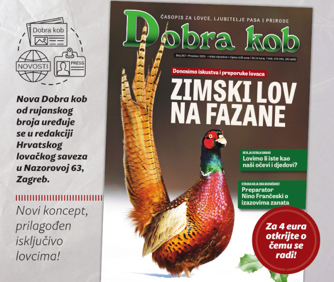 Zimski lov na fazane uz savjete i preporuke lovaca tema je broja Dobre kobi u prosincu. Pišemo i o tome koliko promjena u reproduktivnoj dinamici može utjecati na genetiku divlje svinje, koji su mogući scenariji za afričku svinjsku kugu prema mišljenju stručnjaka, a donosimo i najnoviji popis lovišta po zonama ograničenja, zaštite i nadzora te zaraženim zonama po pitanju ASK. Razgovarali smo i s olimpijcem Androm Knegom, legendom Cibone i strastvenim lovcem, preparator Nino Frančeski govori o izazovima svog posla, obradili smo i lovačke vijesti iz susjednih zemalja, ali i priču o liski kao divljači te kroz kulinarski aspekt. Lovci već tradicionalno kreću u njen lov u neretvanske močvare i rukavce te ju donose na obiteljski stol, ali ove godine to je neizvjesno zbog nove EU Uredbe REACH. Dobru kob potražite od 1. prosinca na kioscima ili se pretplatite, u tom slučaju od 12 brojeva, dva dobivate gratis. Sadržaj na više od 80 stranica svih 12 mjeseci u godini u službi je lovaca i lovstva!