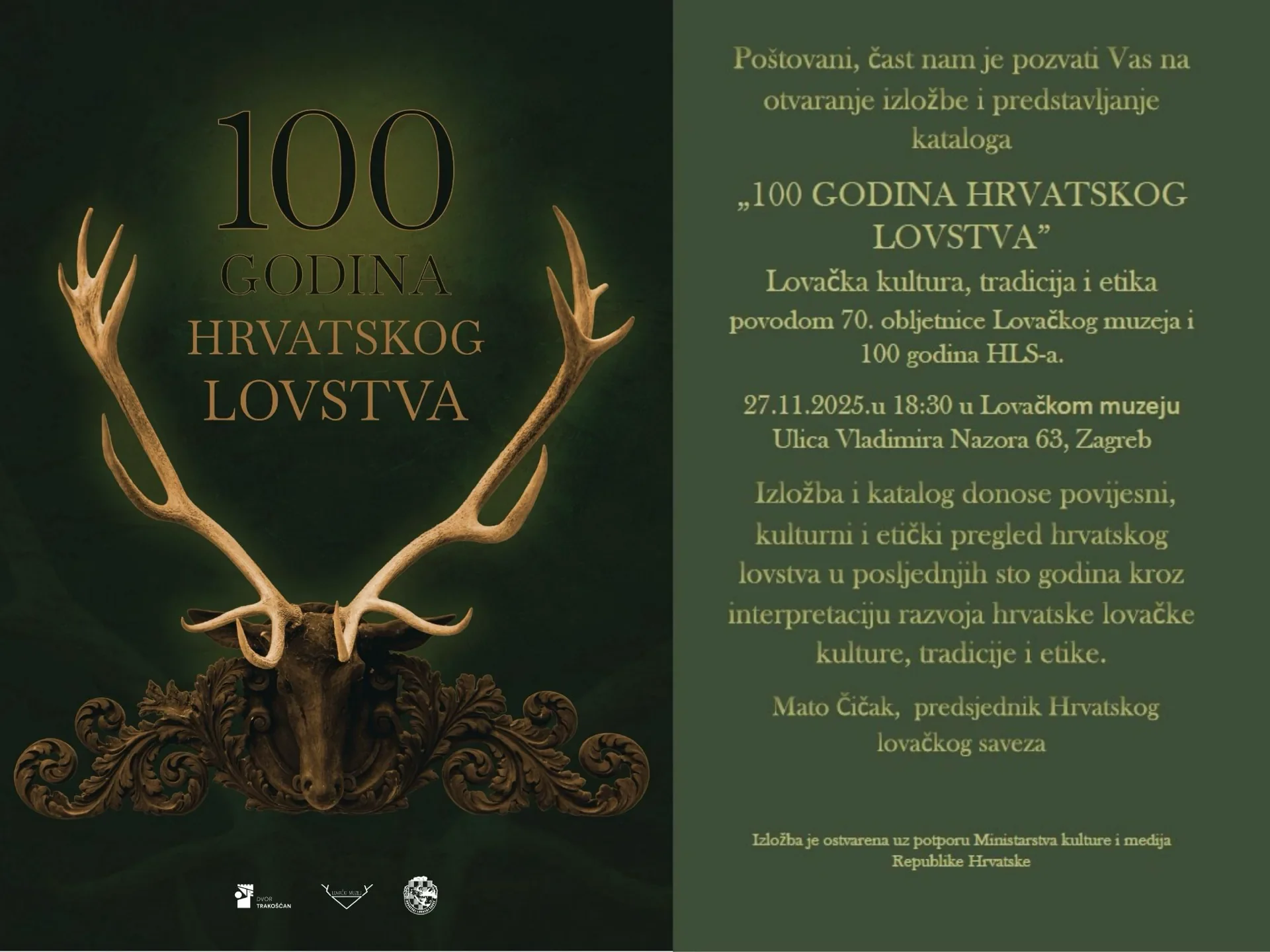 Povodom 100. obljetnice Hrvatskog lovačkog saveza i 70. obljetnice Lovačkog muzeja pozivamo Vas na izložbu „100 godina hrvatskog lovstva – lovačka kultura, tradicija i etika“ koja se otvara u četvrtak, 27. studenog 2025. u 18.30 u Lovačkom muzeju, Ulica Vladimira Nazora 63, u Zagrebu.