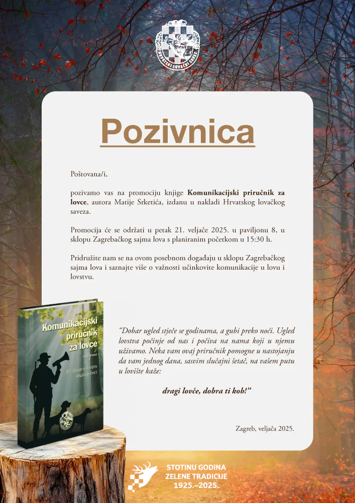 Pozivamo vas na promociju knjige “Komunikacijski priručnik za lovce” autora Matije Srketića, koja će se održati 21. veljače 2025. u 15:30 sati u paviljonu 8 na Zagrebačkom velesajmu u sklopu Sajma lova.