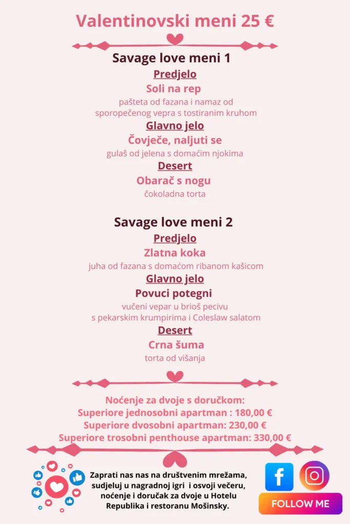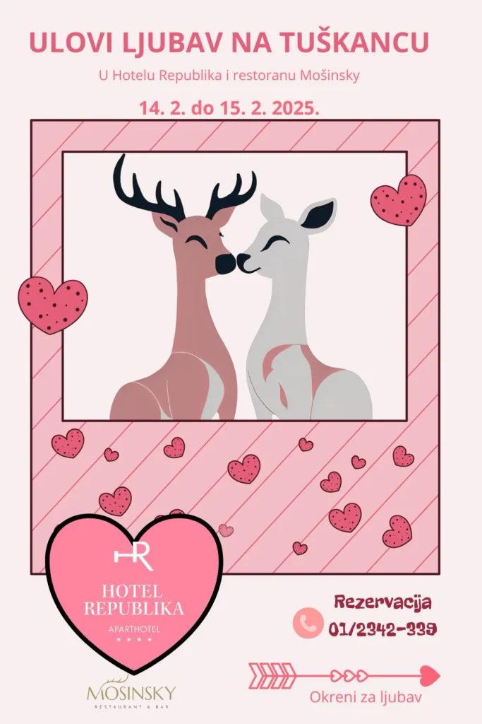 Hotel Republika, restoran Mošinsky i Lovački muzej i ove godine pripremaju nezaboravnu večer za zaljubljene! Na Valentinovo, 14. veljače, i dan kasnije, 15. veljače, od 19:00 sati, očekuje vas prava gozba za osjetila – raskošne lovačke delicije uz sudjelovanje u nagradnoj igri s bogatim nagradama!